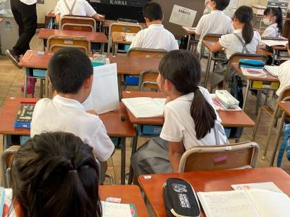 1人分は何個かを求める「あまりのあるわり算」の学習をしています。図で考えようかな、九九を使って考えようかな。答えの見つけ方を考えて、交流しました。