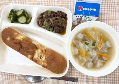今日の献立は、おさつパン・牛肉のデミグラスソース煮・スープ・きゅうりのピクルス・牛乳です。
