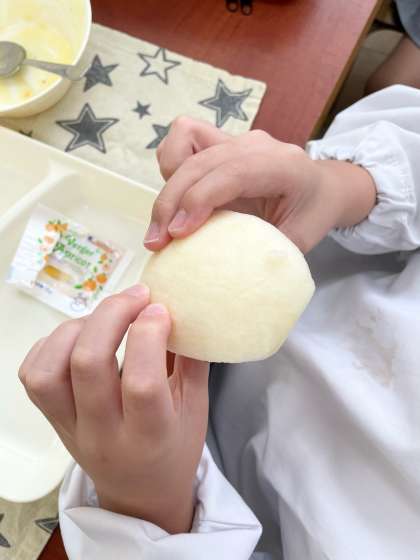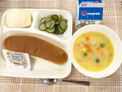 今日の献立は、コッペパン・アプリコットジャム・豆乳コーンクリームシチュー(米粉)・きゅうりのバジル風味サラダ・りんご・牛乳です。
