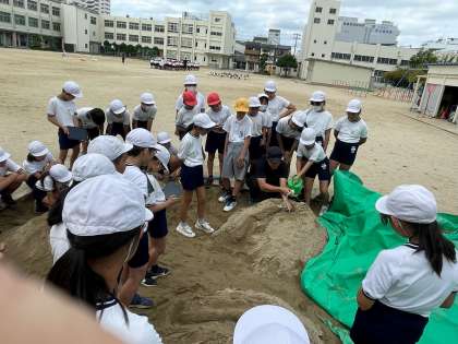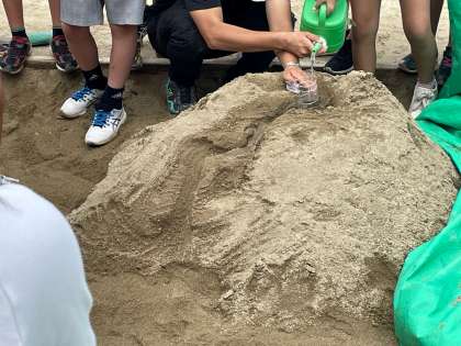 流れる水のはたらきについて、3つの予想をしました。「けずる・運ぶ・積もらせる」です。自分たちで考えた予想について、砂場で山を作って水を流すとどうなるかを確かめました。