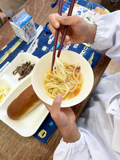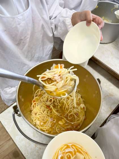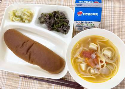 今日の献立は、黒糖パン・牛肉の香味焼き・ほたて貝とトマトのスープスパゲッティ・白菜のピクルス・牛乳です。