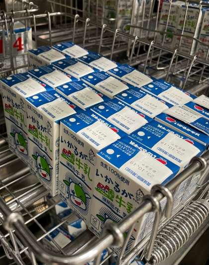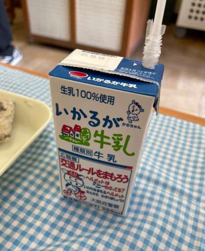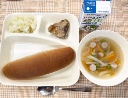 今日の献立は、黒糖パン・かつおのガーリックマリネ焼き・ウインナーとじゃがいものスープ・キャベツのサラダ・牛乳です。