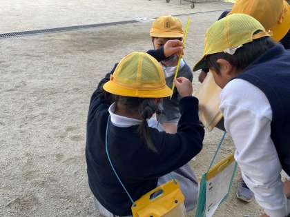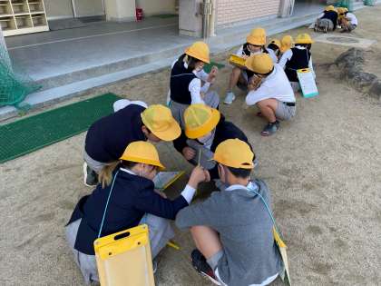 日なたと日かげの地面の様子は、どんなところが違うかな?明るさやあたたかさ、しめりぐあい等を、班で協力して調べました。