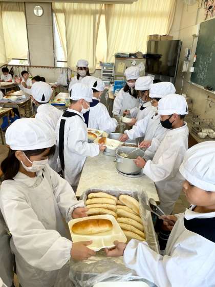 今日の献立は、おさつパン・鶏肉のガーリック焼き・スープ煮・野菜のソテー・牛乳です。