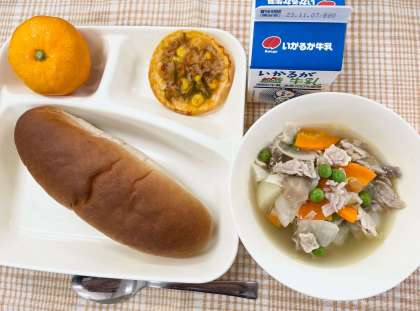 今日の献立は、黒糖パン・豚肉と野菜のスープ煮・変わりピザ・みかん・牛乳です。