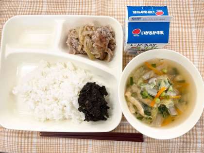 今日の献立は、ごはん・豚肉のスタミナ焼き・すまし汁・のりのつくだ煮・牛乳です。