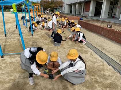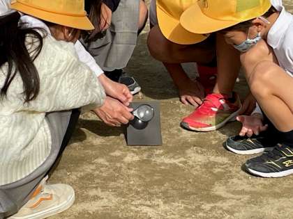 虫めがねを使って、黒い紙の上に光を集める実験をしました。光を小さく小さく集めたら、紙から煙が出てきました。みんな興味いっぱいに実験をしていました。