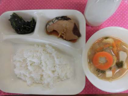 なまりぶしのしょうが煮、みそ汁、ほうれん草のごまあえ