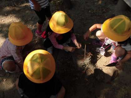 えの森の木漏れ日の下で、「焼き芋ごっこ」をしているのは一年生です。微笑ましく、かわいらしい光景です。