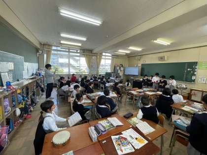 グループごとに「森のたんけんたい」の歌詞にぴったりの楽器を見付けて、リズムを発表しました。見ているみんなは、歌を歌います♪