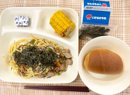 今日の献立は、1/2黒糖パン・ウインナーときのこの和風スパゲッティ・焼きとうもろこし・固形チーズ・牛乳です。