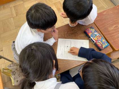 次の時間は、プレルボールの試合をします!この時間はチームに分かれて作戦タイムです。学習カードに作戦を書いたり、自分たちの動きを図で示したり、やる気いっぱいです。