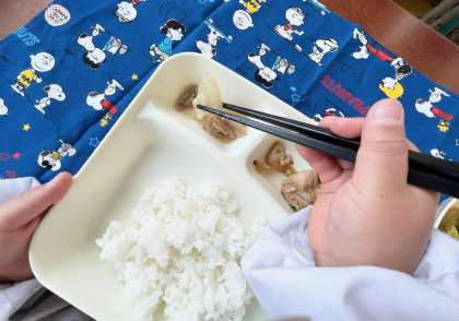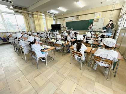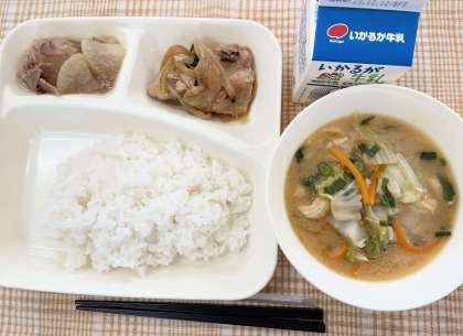 今日の献立は、ごはん・鶏肉の甘辛焼き・みそ汁・だいこんの煮もの・牛乳です。