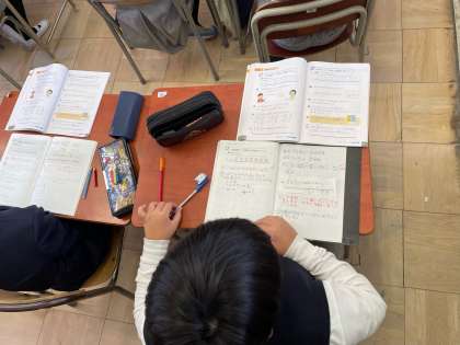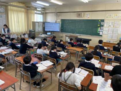 数直線をもとに、分数の大きさを考えました。学習の終わりに、ノートに今日の振り返りを書きました。表情のマークや感想を書くと、わかった達成感が積み重なっていきますね。