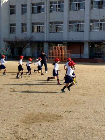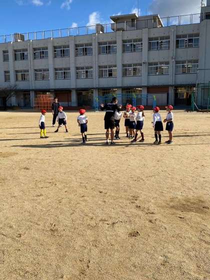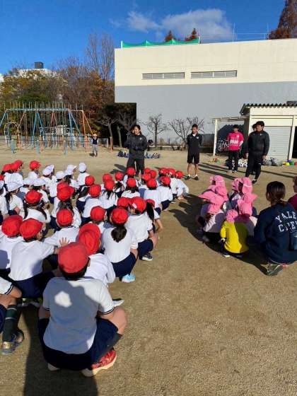 今日はセレッソ大阪サッカースクールのコーチの方11名に来ていただき、榎本幼稚園の園児と一緒にサッカーの体験をしました。