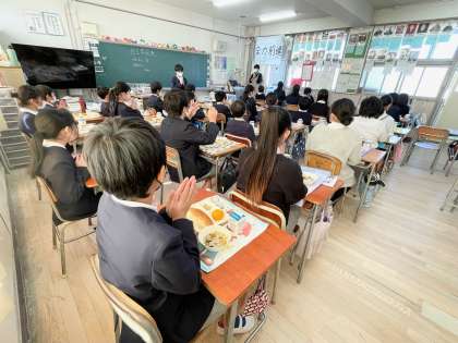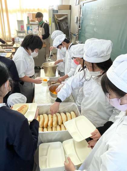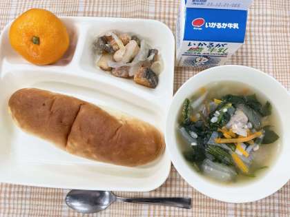 今日の献立は、おさつパン・さけのマリネ・肉だんごと麦のスープ・みかん・牛乳です。