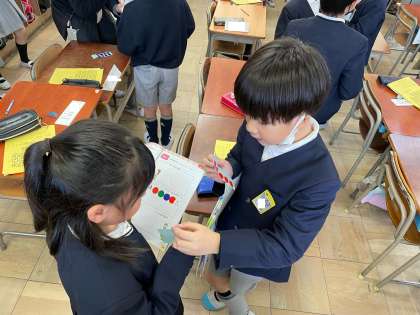 アルファベットの大文字を学習しています。今日は、いろいろな友だちと英語でやりとりをして、自分の頭文字シールを渡しました。