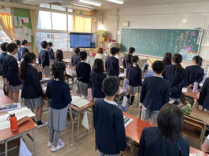 校長先生からのお話を聞いたり、校歌を歌ったりしました。