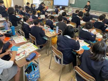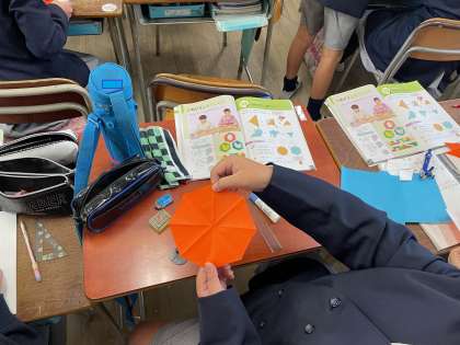 折り紙とコンパス、はさみを使って、多角形を作りました。正六角形や正八角形に挑戦です。さあ、切って広げてみて、正多角形ができあがっているかな?