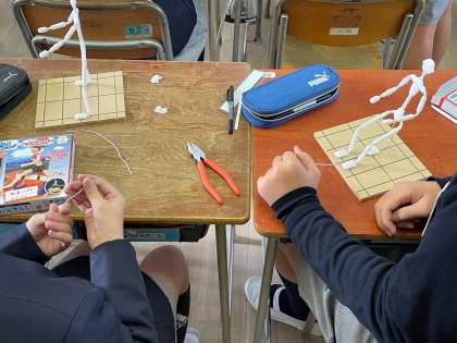 「未来のわたし・ぼく」をテーマに、将来の自分の姿を想像しながら針金と紙粘土を使って製作します。今日は、針金を動かしたり切ったりしながら形を整えました。