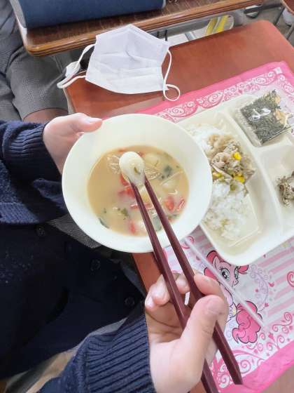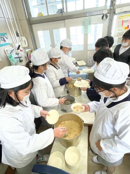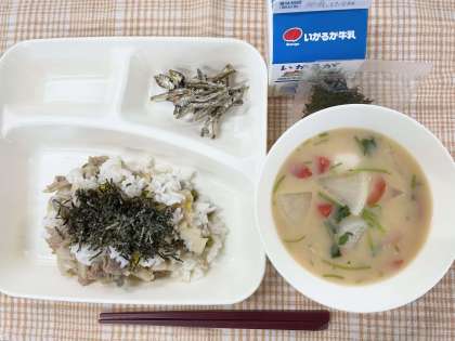 今日の献立は、れんこんのちらしずし・ぞう煮・ごまめ・牛乳です。