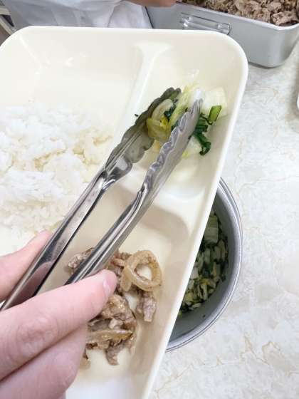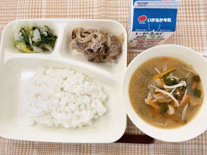 今日の献立は、ごはん・豚肉のごまだれ焼き・みそ汁・きくなとはくさいのおひたし・牛乳です。