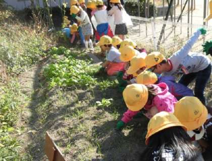 そのあと1年生は、2列に並んでえの森へ。緑色のえの森軍手をはめて、草抜きをしていました。