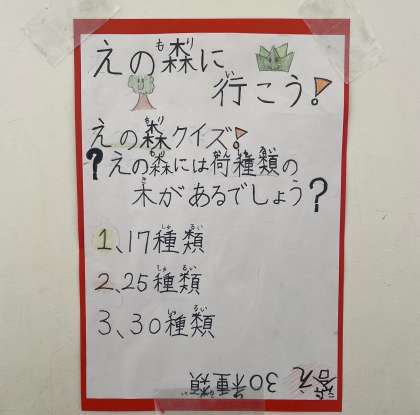 今、学校のいろいろな場所に「えのもりクイズ」が掲示されています。みんなの大好きな、えのもりについてのクイズ!どのくらい正解でできるかな?