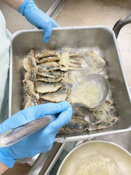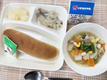 今日の献立は、コッペパン・マーガリン・あじのレモンマリネ・てぼ豆のスープ煮・和なしのかんづめ・牛乳です。