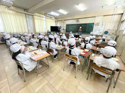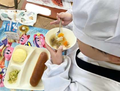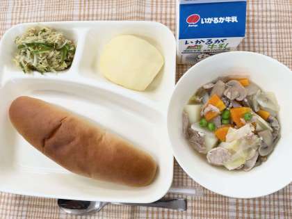 今日の献立は、黒糖パン・豚肉と野菜のスープ煮・カレーソテー・りんご・牛乳です。
