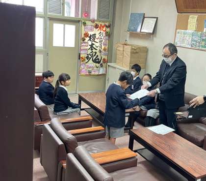 読書感想文コンクールの表彰があり、校長室で表彰状を渡していただきました。