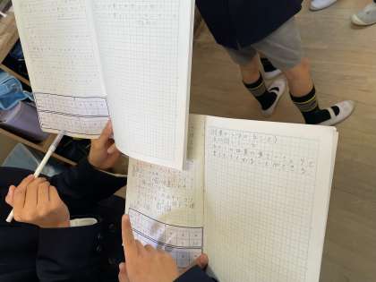 てこの左右のうでで、おもりをつるす位置やおもりの重さを変えると、どんな時に水平に釣り合うのかを考えました。予想をたてて、友だちと説明をしあいました。たくさんの友だちと意見を共有することができました。
