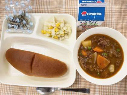 今日の献立は、黒糖パン・ビーフシチュー・カリフラワーとコーンのサラダ・ミニフィッシュ・牛乳です。