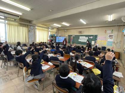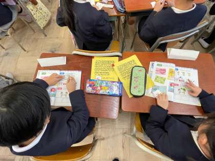 丸や三角形、四角形などの形の名前を学習しました。歌を歌ったり、C-NETの発音を聞いたりしながら、楽しく学習をしました。よく聞き取れています!