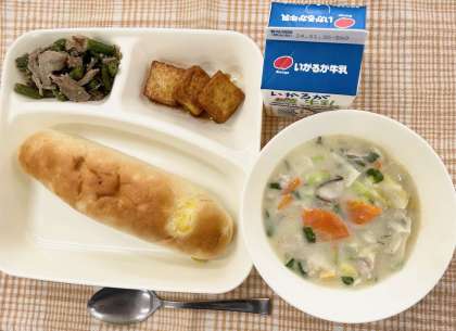 今日の献立は、おさつパン・はくさいのクリーム煮・あつあげのピリ辛じょうゆかけ・豚肉とさんどまめのオイスターソースいため・牛乳です。