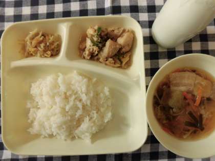 鶏肉のごまだれ焼き、ソーキ汁、もやしのしょうが風味あえ、ごはん、牛乳 でした。
