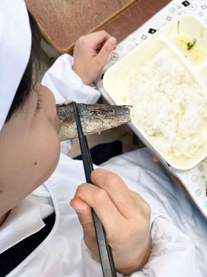 今日の献立は、ごはん・さごしのしょうゆだれかけ・とうふのみそ汁・みずなの煮びたし・牛乳です。
