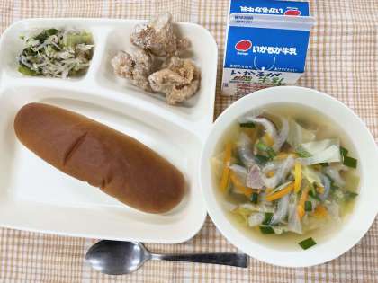 今日の献立は、黒糖パン・鶏肉のからあげ・中華スープ・チンゲンサイともやしの甘酢和え・牛乳です。