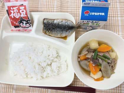 今日の献立は、ごはん・いわしのしょうがじょうゆかけ・含め煮・いり大豆・牛乳です。