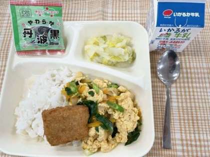 今日の献立は、カツ丼・白菜の甘酢あえ・ソフト黒豆・牛乳です。