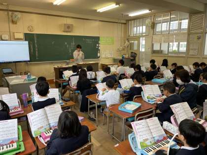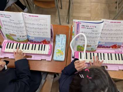 「汽車は走る」を学習しています。汽車の走る様子を、けんばんハーモニカや手拍子で表現しました。汽車のスピードも変えながら表現を楽しみました。