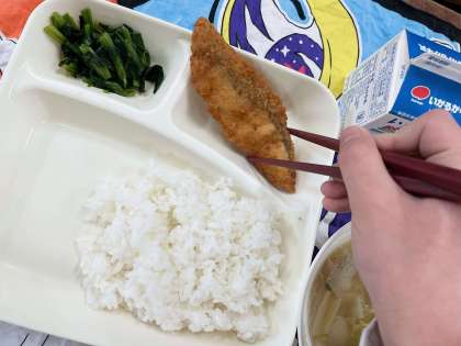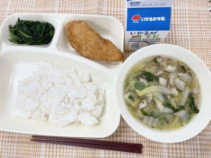 今日の献立は、ごはん・たらフライ・うすくず汁・ほうれんそうのおひたし・牛乳です。
