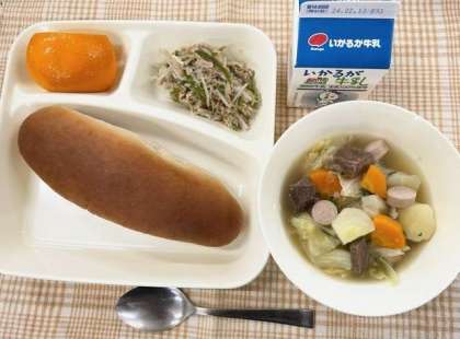 今日の献立は、黒糖パン・ポトフ・ツナと野菜のソテー・いよかん・牛乳です。