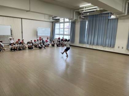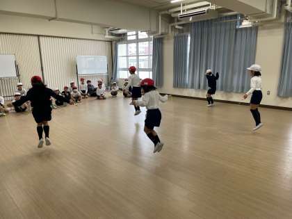なわとび連続跳び検定♪の音楽に合わせて、級ごとにみんなの前でなわとびをしました。友達からの応援もうれしくて、やる気いっぱいです!