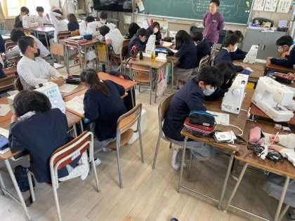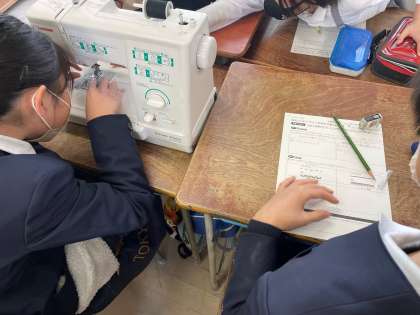 ミシンの糸通しのテストです。グループになって、一人ずつテストをしました。友達が挑戦している様子を見守っていました。