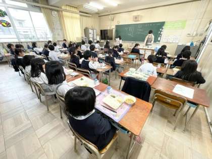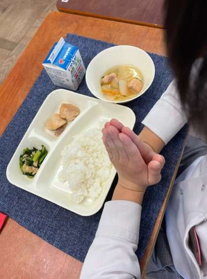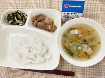 今日の献立は、ごはん・鶏肉のなにわ甘辛ソースかけ・船場汁・こまつなの炊いたん・牛乳です。