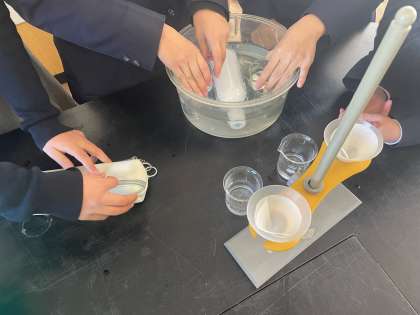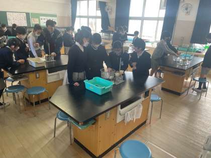 ろ過した水溶液を氷水で冷やすと、ミョウバンや食塩は取り出すことができるのかを実験しました。すぐに結果は出ませんが、ビーカーの様子をじっと観察していました。