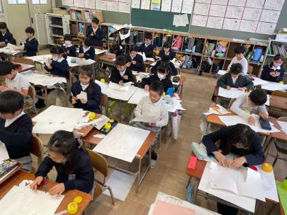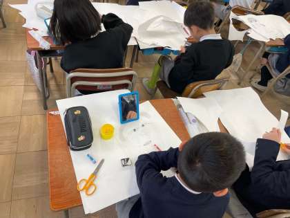 自分の顔を鏡で見て、画用紙に大きく描きました。この絵をもとに、紙版画を制作しています。髪の毛や歯などの細かい部分もよく見て制作しています。