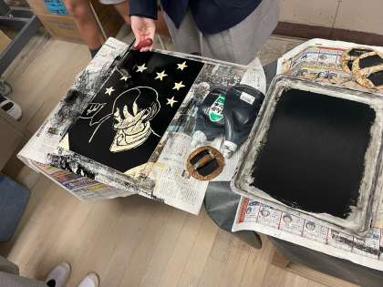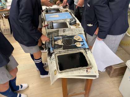 版画を彫り終わった児童から、ローラーでインクをしっかりと伸ばしてバレンを使って紙に転写させました。友達とも協力しながら、丁寧に最後の仕上げをしました。