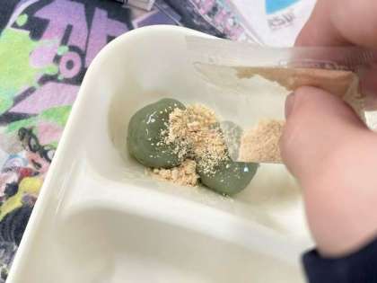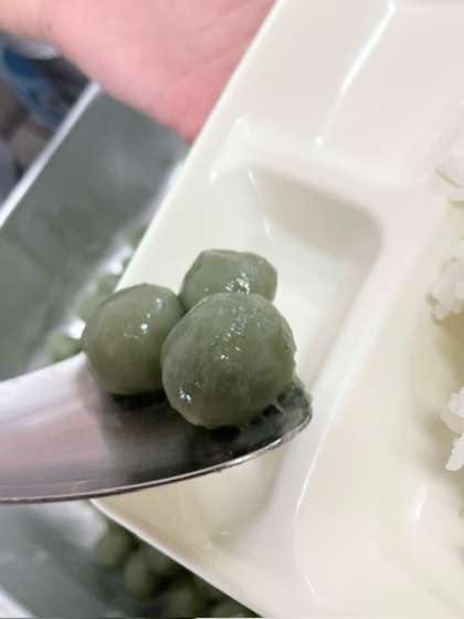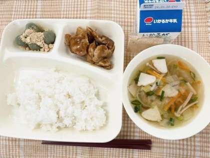 今日の献立は、ごはん・鶏肉のみそバターソースかけ・五目汁・きな粉よもぎだんご・牛乳です。